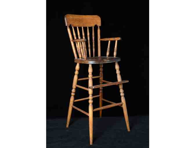 Child's wooden high chair with turned legs; measures 38" high. Antique.