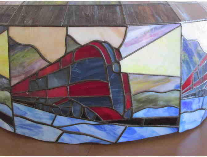 A very rare, one of a kind, stain glass light fixture that features New York Central Locomotive #5344 that was streamlined and named Commodore Vanderbilt.