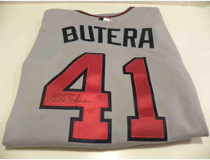 This is an authentic Minnesota Twins gray road jersey signed on the back number 41 by popular Twins catcher Drew Butera.