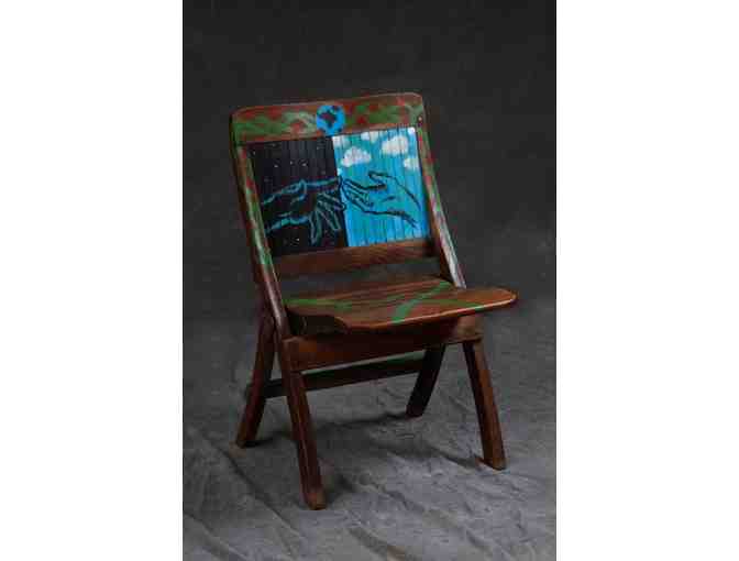 Reminiscent of Michelangelo's "Hand of God", this piece speaks volumes to the viewer. "Hand drawn" and painted, it inspires the viewer to think of the connections we have to the earth, the stars and most especially, to one another. This chair is all about "Friendship"!