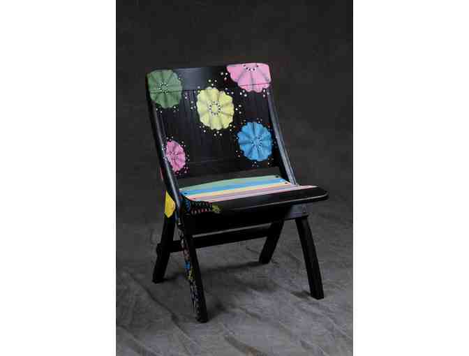 The bulbous flowers and vertical stripes just POP off the black background creating a fabulous vibe on this chair!  The colorful graphics invite the sitter to "take a seat" and enjoy!