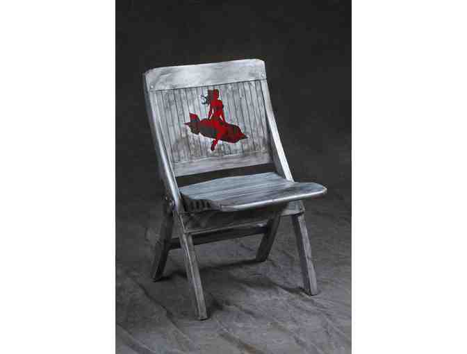 A brilliant red illustration on a silver finish, this memorable piece is reminiscent of the work of Alberto Vargasm, 20th century Peruvian painter of pin up girls. This chair will appeal to WWII history buffs, collectors and artists alike!