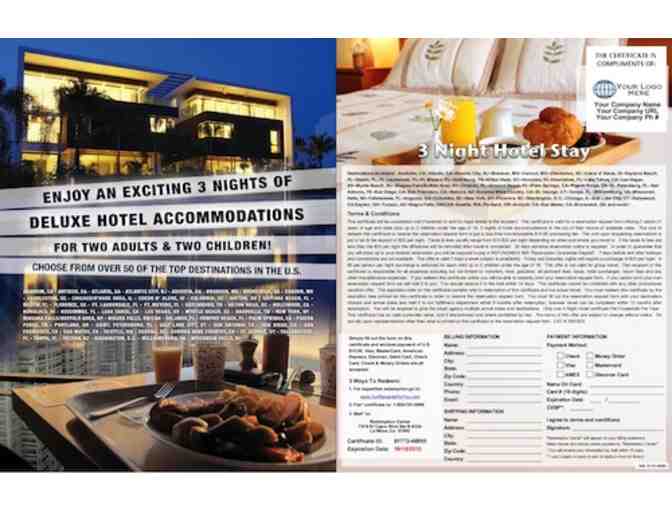 Recipients receive 3 nights of deluxe hotel accommodations for four, allowing for 2 adults, and 2 children under the age of 18. Participants may choose from more than 50 available major destinations. This offer only requires 30 days advance notice to book. No timeshares or sales presentations, Guaranteed!