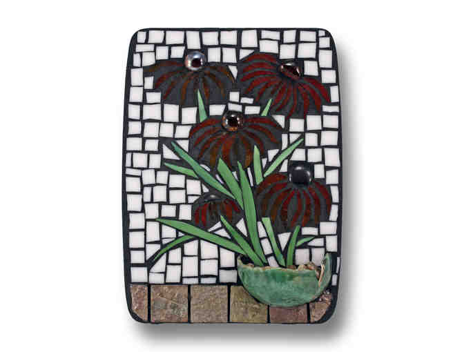 “After many years of creating stained glass art, I found I had a tremendous amount of scrap glass that I could not bring myself to throw out. Because I do not like to waste anything (I also have many “found objects”), I decided to try creating with mosaics. I love “repurposing” and using objects in ways other than what they were designed for, and at the same time, putting less into landfills. I can find a use for just about anything.