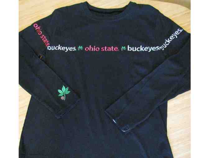 This 100% cotton knit black long-sleeved ladies(XL) tee features embroidered “Ohio State Buckeyes” with buckeye leaf inserts after each as lettering crosses front, continue across upper sleeve, across back and other sleeve. Lettering for Ohio State is in red; Buckeyes in gray and small brown buckeyes with green leaves complete this decoration on the cotton tee.