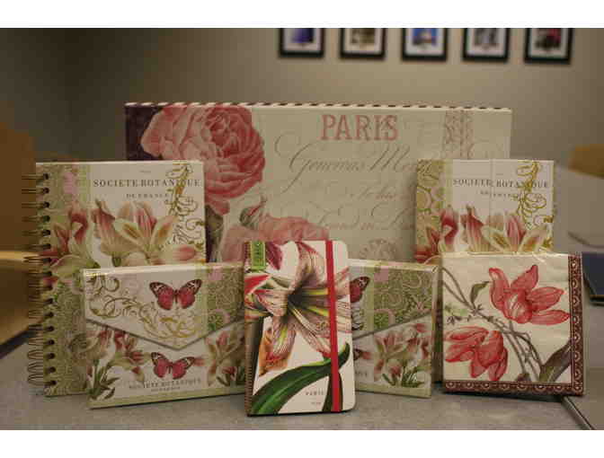 2 sets of note cards with 12 notes in two designs with coordinating envelopes; note set with 2 sizes stationery and 4 strips of Post-it notes in a holder; spiral bound journal book; small note book and coordinating cocktail napkins - all in a large decorative box. The box also contains 100 Forever stamps.