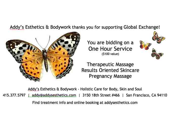 Treat yourself or a loved one to a one hour massage or facial at Addy's Esthetics & Bodywork, located in San Francisco's Mission District.