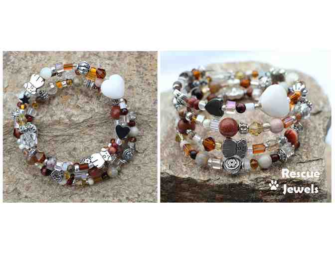 Bid on this beautiful, handmade, one-of-a-kind spiral bracelet made to fit any adult wrist. It features pewter dogs, jasper, tiger eye, Swarvoski crystal, goldstone, hematite.