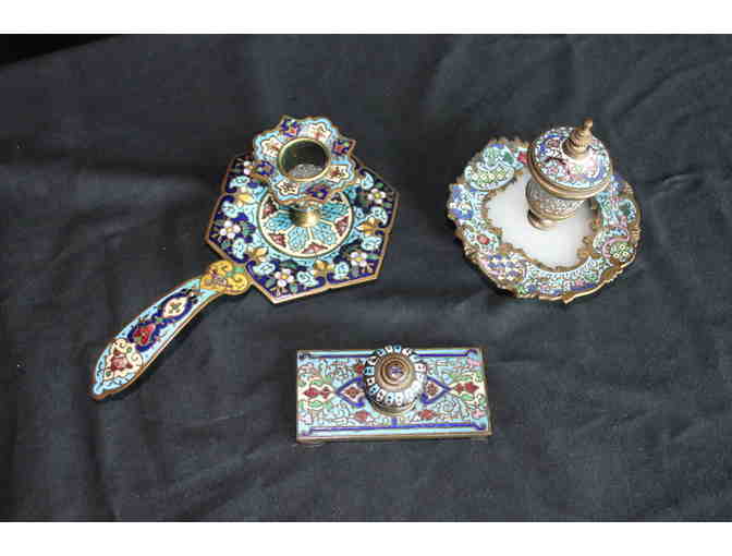 French Enamel Champleve Desk Set Including a Chamber Candlestick,