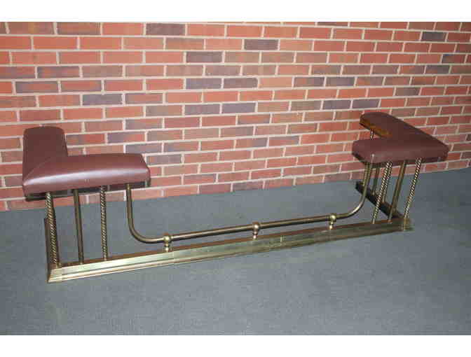 This beautiful English brass club fender with two maroon, leather cushions will focus attention to your home's fireplace. Dating back to the 18th century, English club fenders, or fireplace benches, were commissioned by the best British homes and posh private clubs to give people a place to warm themselves. Now you and your guests can enjoy the same warmth. The perfect place to perch on cold days, the fender certainly adds a warm welcome.