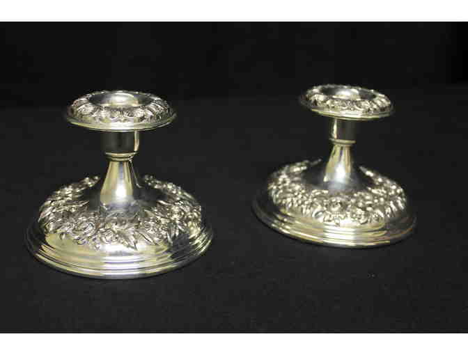 Pair of sterling silver candlesticks by S. Kirk & Son in the repoussee pattern, C. 1900. They hold the candles low to be functional and will add illumination to your room.