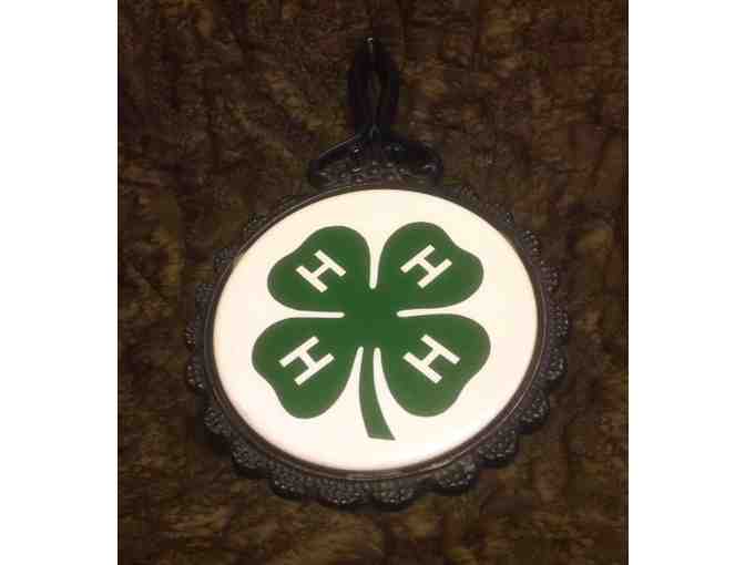 Metal and ceramic trivet with 4-H clover design.