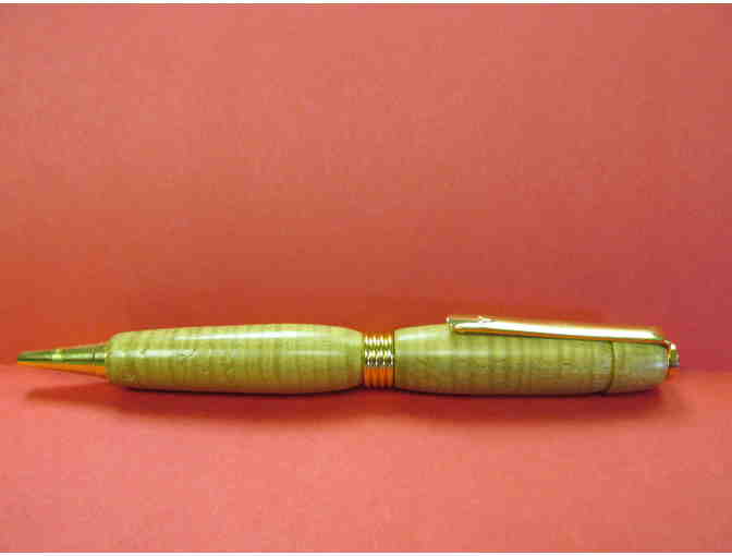 Members of the Hocking Hills Artists and Craftsmen Association partnered with the 4-H program at OSU Extension, Hocking County, during 2014 to teach 4-H'ers marketable crafts. 4-H'ers learned to cut and fuse stained glass, do leatherwork, turn wood, and weave pine needle baskets. As part of the program, Dr. Roy Bontrager taught 4-H'ers how to turn wood to create these one-of-a-kind wooden ink pens. Up for auction is this curly chestnut burl Cross pen with 24 k gold accessories. Ideal for gift-giving, this pen was crafted by Dr. Bontrager.