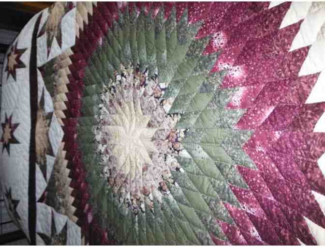Amish handmade quilt, "Stars in the Stars." A unique Amish made Stars in the Stars quilt. 105 x 111. The quilt has a lot of vibrant colors and intricate detail. The top of the quilt has 3 beautiful stars of tans, purples and greens. The main body of the quilty has a large star in each corner. In the middle of the quilt is a small tan star that bursts our in color to a large finely detailed star with shades of tans, browns, greens, purple and a tint of light pink. On the border is applique tans and various shades of brown flowers with green leaves.