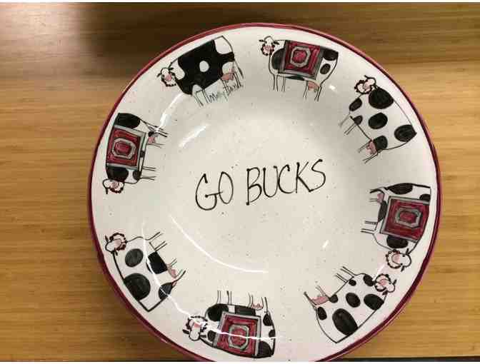 A 12 1/2" Molly Dallas Spatterware Bowl hand-painted with OSU cows. "Go Bucks" is written in the middle of the bowl.