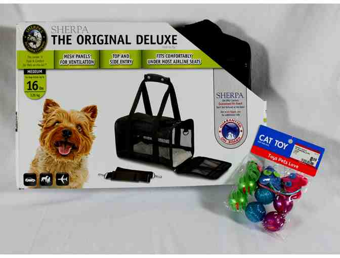 This soft sherpa carrier is medium in size and holds either a dog or cat up to 16 pounds.