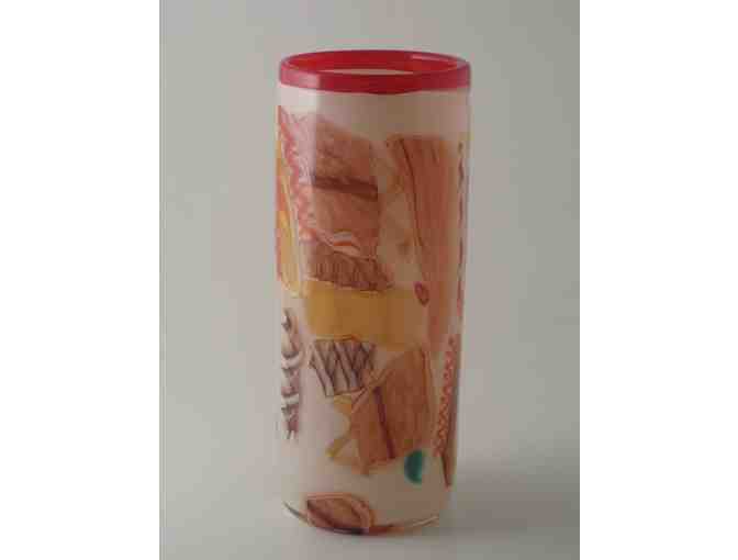 This is a cylindrical glass vase with a red lip and encased decorations measuring approximately 4.5 inches in diameter and 12 inches tall.