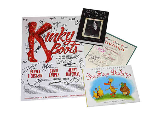 Kinky Boots package, including Outer Critics Award to Harvey Fierstein and Cyndi Lauper; Kinky Boots poster, signed by Mr. Fierstein, Ms. Lauper and original Broadway cast; Cyndi Lauper: A Memoir, signed Ms. Lauper; and The Sissy Duckling, written and signed by Mr. Fierstein