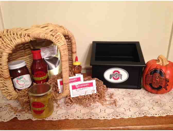 Ross County Basket: Taste and see Historic Ross County. Two tickets to the outdoor drama Tecumseh for the 2015 season, ceramic OSU pumpkin, OSU office organizer; assorted products produced in Ross County: Ben's Sweet Hot Mustard, Hirsch's Apple Butter, Pap's Hill Top Honey, Two Roasting Joes Coffee in Buckeye flavor, Ben's Sweet and Hot BBQ Sauce.
