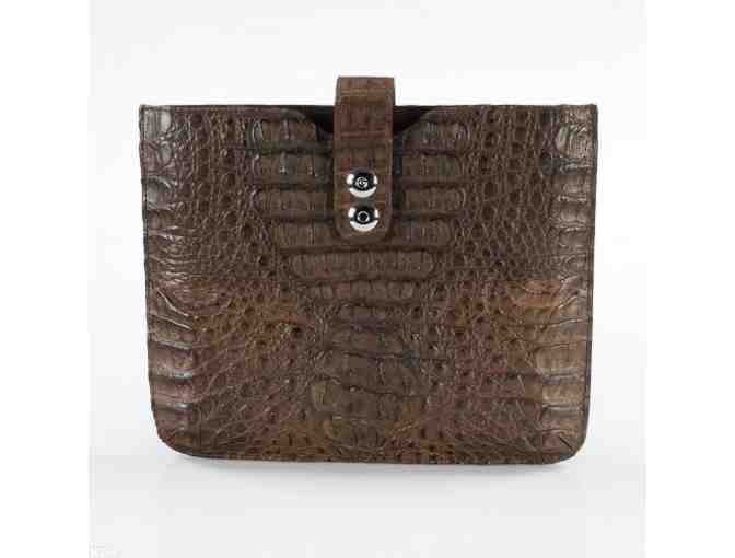 Using the finest exotic leathers and materials, Nina Raye's bags complement any ensemble. This sleeve is stylish enough and roomy enough to store your electronics safely and fashionably. This piece is a handcrafted brown iPad sleeve with a snap enclosure and removable strap. This piece is made from genuine crocodile leather. Measures approx. 11" x 9" (bag); 44" (strap). List Price: $1,750.00