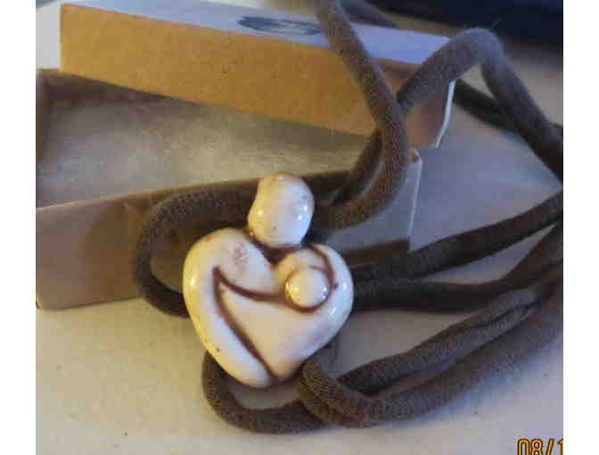 This is a porcelain pendant, glazed brown. It comes with a soft, adjustable, recycled t-shirt cord and gift box.