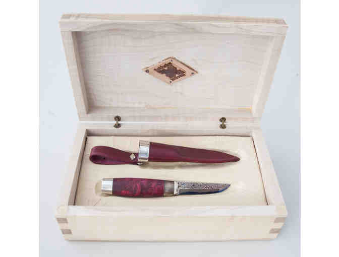 Birch handle and silver Damascus blade. Blade made by Morten Haakonsen. Presentation box made by Roger Tokheim.