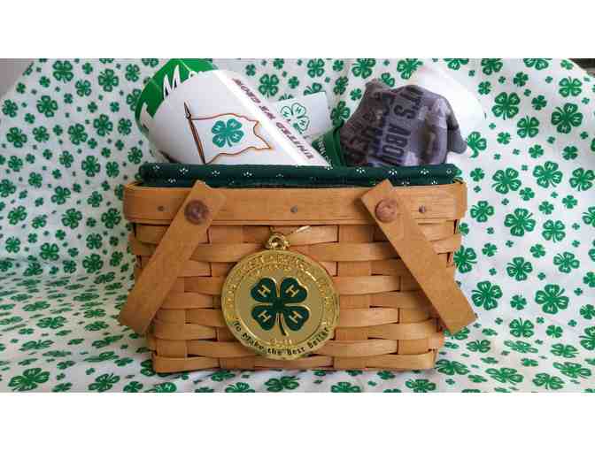 This Highland County Basket is a retired Longaberger basket with liner. Inside the basket there is a 4-H medallion, 4-H cup, bumper sticker (4-H More Than You Ever Imagined,) 4-H clip, key chain, 4-H mug, and white 4-H t-shirt. Please see additional photo for a picture of the 4-H logo on the t-shirt.