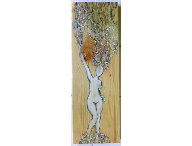 Mixed Media on Salvaged Wood, 16"h x 5.5"w.