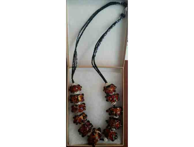 Beautiful necklace, with large amber-colored beads, earthtone and graphite beads, and some "bling" in between!