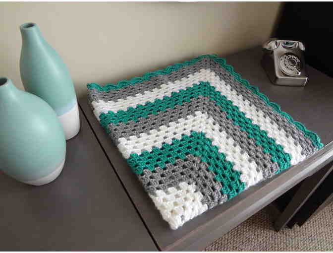 Soft cuddly handmade crochet baby boy granny square afghan in teal, grey and white. Perfect for new baby gift or new mom. Made from soft acrylic yarn, easy wash and dry.