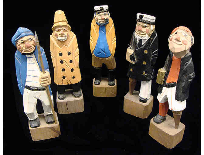 This quaint set of nautical men have been handcarved and painted in New England and are part of the popular folk art from that area. The set is five pieces and include pirates, captains, and a fisherman. As a group or individually they will bring a smile to your face. Each stands at 8" high.