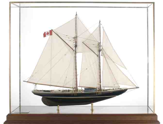 This detailed boat will be a centerpiece in any maritime enthusiast’s home. The hull is painted black above the waterline and bronze below. A planked deck carries dories with oars and casks, seine nets, anchor windlass, anchor, cleats, etc. Also rigged with a full suite of finely stitched sails, this Schooner, in striking condition, will sure to be a conversation starter. Mounted into an inlaid glass display case, her condition will remain untampered. She sits with an overall height of 32.5", length of 41”, and a 13” depth.