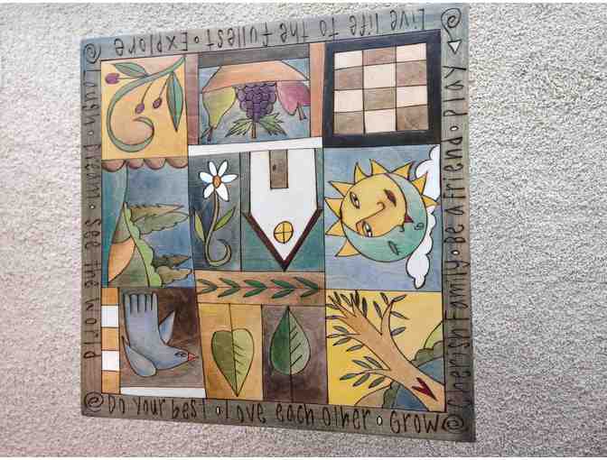 Hand designed and hand made of solid wood, with a cute theme on top and words written around the edge of the table top. “Cherish family, Live life to the fullest, Do your best, Love each other.” Hand made by STICKS, Inc. The table is 24” tall and the top measures 16” square. Estimated value is $700. Donated by Steve and Cindy Rasmussen.
