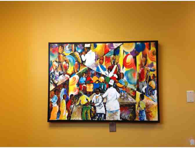 Be the proud owner of this dramatic signed, framed painting. It is a brightly-colored abstracted depiction of a community clinic filled with people of all ages being treated for different ailments by both doctors and nurses. 33.25" x 44" framed.