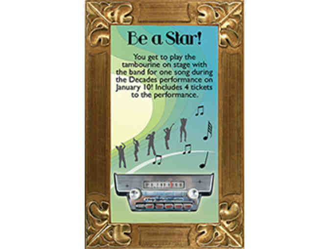 This is your chance to appear onstage with Broadway singers and musicians! You will be called onstage to play tambourine along with the band during the 7:30pm perfromance of Neil Berg's DECADES on Saturday, January 10, 2015. Includes 4 tickets to the show so you can bring your biggest fans!