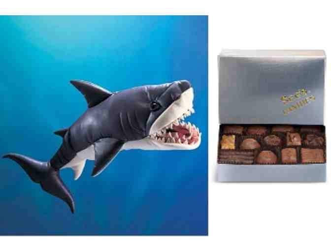 You can run but you can't swim fast enough to evade this awesome predator of the deep that wants to deliver a candygram. Fortunately, his skin is soft and his teeth are vinyl, so even if he catches you, you'll feel no pain from this cuddly (but fierce!) shark puppet. Enjoy the See's Candies Silver Box of Assorted Chocolates that this great white shark puppet is delivering.