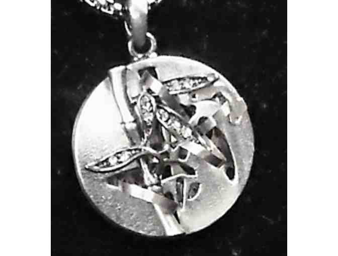 A unique pendant and chain made from refurbished clock parts designed by local artist Kaya Estey in a style almost Victorian-Science Fiction . a.k.a Steampunk. An excellent accessory, adding unique charm to any outfit! Both chain and pendant are made from a shiny gray material. Rhinestones in the pendant are a brilliant light-green color.