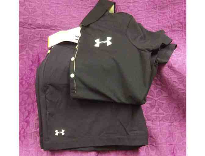 This is no ordinary golf outfit. Designed and made with Under Armour performance technology, this set of black and neon-green golf polo shirt and shorts were built to be tough, breathable, and stylish. You'll look good and keep cool while on the green. Women's small. Polo shirt is a mix of polyester and elastane. Shorts are nylon and elastane.