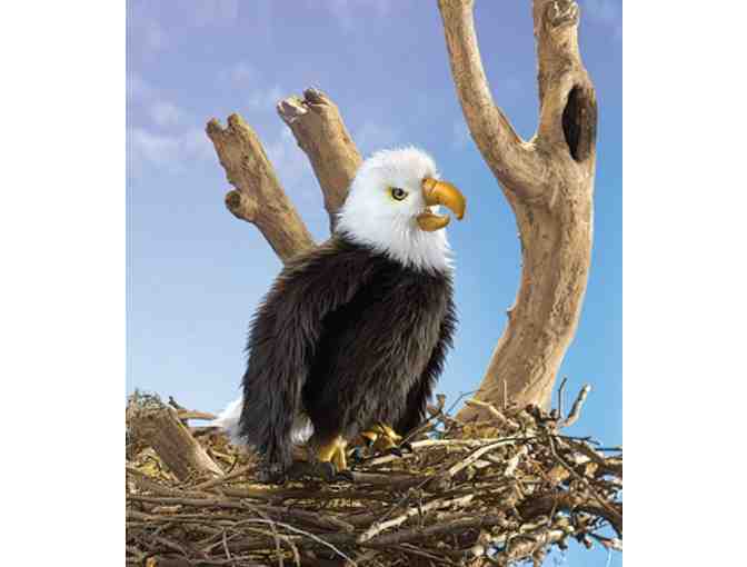 Regally perched and ready to swoop comes this unmistakable symbol of majestic beauty, great strength and long life. This Folkmanis Perched Eagle puppet is realistically rendered with keen, piercing eyes and plumage of dark brown with white head and tail. This puppet is a stunning representation of our national bird often prominent in seals and logos and sacred to Native American cultures.