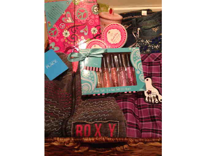 Everything your tween needs to be fashionable! Includes size 10 slim fit embellished premium Justice jeans, size 8 adjustable waist Osh Kosh B'gosh purple paid skirt, youth medium Roxy zip hooded sweatshirt, decorative stationary set, lip gloss set, strawberry covered mug, bath salts, toe ring and nail stickers. $50 gift card for The Children's Place for your next shopping spree.