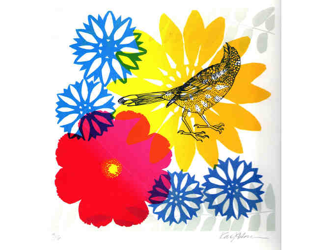 Artist Karen Hatch overlaid transparent primary colors to create many more colors. One print from the edition is in the collection or the Hudson Valley Heirloom Seed Library. It depicts Prairie flower seed mix of Red Dazzler Cosmos, Wild Yellow Sunflower, and Blue Cornflower, and a happy bird.