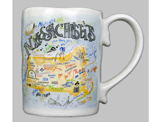 Celebrate the Commonwealth of Massachusetts with every sip from this striking commemorative mug. The mug sports a fun, irregular shape and a design with a watercolor effect, with a cute fisherman image hiding inside on the bottom. It comes packages in a colorful, embossed tin box.