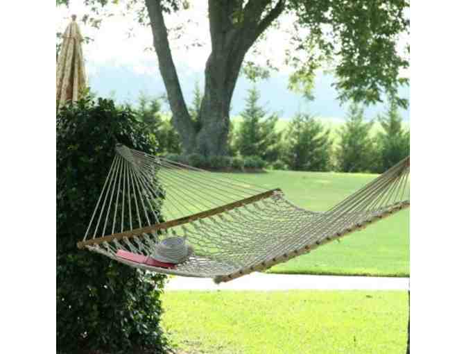 This large original cotton rope hammock will have you relaxing and not having a care in the world in no time flat. Hand-woven 100% natural cotton 3-ply rope, marine spar varnished white oak spreader bars, and zinc plated hanging hardware includes 2 screw in tree hooks.
