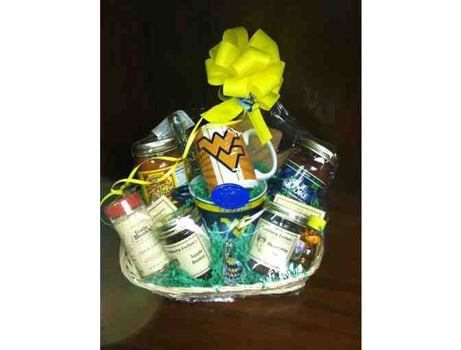 This West Virginia themed gift basket comes with mug & soup bowl, homemade goods such as apple butter, hot pepper butter and even a West Virginia shaped cutting board and much more!