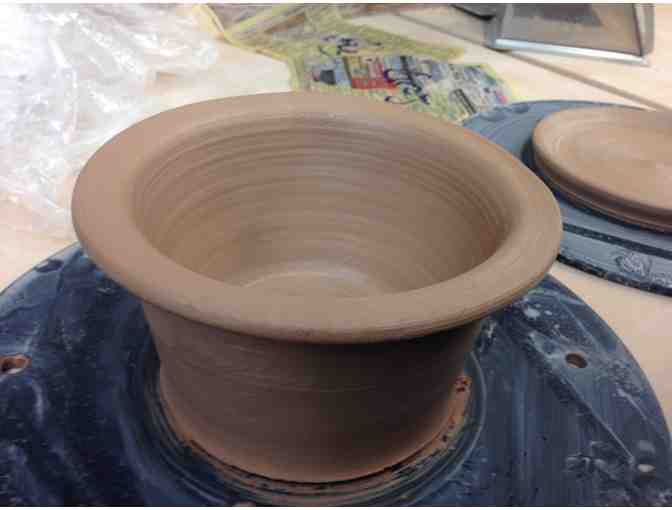 The donated piece is a flower pot/planter and plate. As you can see from the photos the two pieces are "works in progress." They still need to be trimmed, bisque fired, glazed, and fired again. So they will look very different once finished. If I have not glazed them by the conclusion of the auction, the winning bidder can choose their color of preference or possibly meet me at Glen Echo and do the glazing themselves.