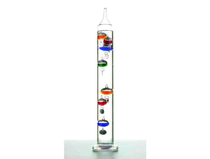 Centuries ago, Galileo discovered that a liquid's density varies with temperature. This work of scientific art contains colored-glass temperature indicator spheres calibrated to within a fraction of a gram to measure indoor temperature. The balls float in a clear liquid, changing position with fluctuations in temperature. The lowest floating sphere indicates the current temperature. The thermometer measures approximately 11 inches tall.