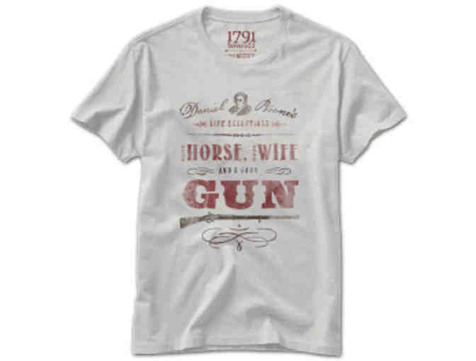 Daniel Boone’s Life Essentials are listed on the front of this 1791 cotton t-shirt: Good Horse, Good Wife, and Good Gun,.