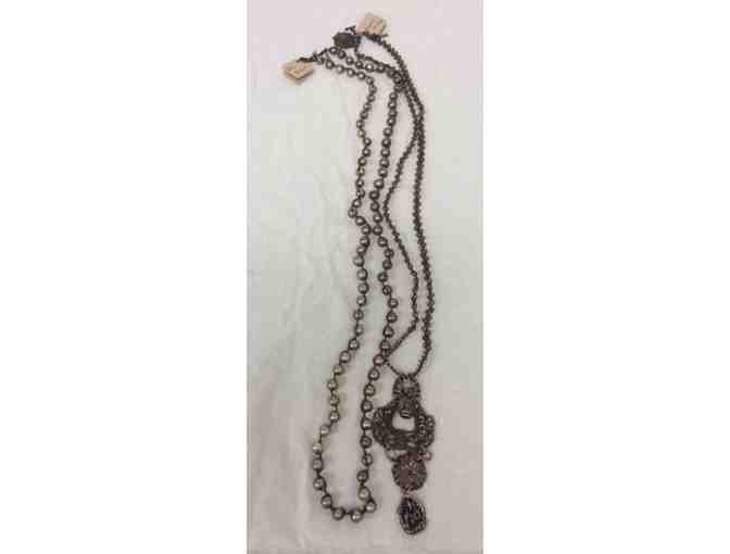 Look great these two great pieces of jewelry from Love Heals in Ojai! Here's a 42" wrap bracelet with Braided freshwater olive pearls with white bronze clasp plus a Funam Smokey 36" necklace with macram Smokey quartz gems with hand carved yellow bronze charms and toggle clasp with a black onyx prism drop.