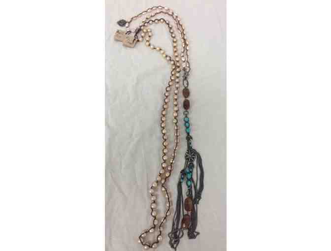 Love Heals Jewelry in Ojai presents these two great pieces of jewelry called Plie Champagne and Amalfi Turquoise. Plie Champagne is a 42" wrap bracelet, Braided freshwater champagne pearls with white bronze button clasp. Amalfi Turquoise is a 36" necklace hand braided champagne pearls with wire wrapped chalcedony nuggets, turquoise beads, and antique silver plated chain with white bronze charms.