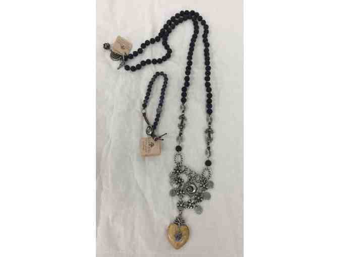 These are two great pieces of jewelry from Love Heals in Ojai including Sol black lava with hand carved Bone Sacred Heart plus Doba Black 7.5" bracelet with black onyx gems and labradorite with white bronze charms.